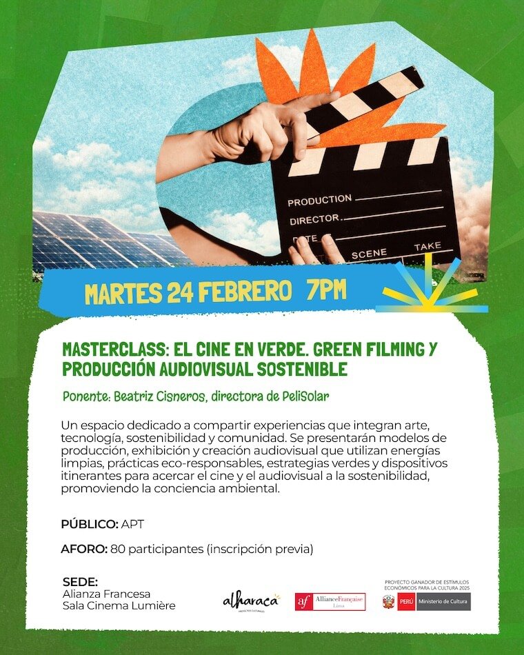 Un espacio dedicado a compartir experiencias que integran arte, tecnología, sostenibilidad y comunidad. Se presentarán modelos de producción, exhibición y creación audiovisual que utilizan energías limpias, prácticas eco-responsables, estrategias verdes y dispositivos itinerantes para acercar el cine y el audiovisual a la sostenibilidad, promoviendo la conciencia ambiental.
